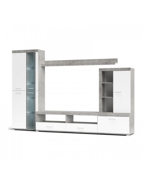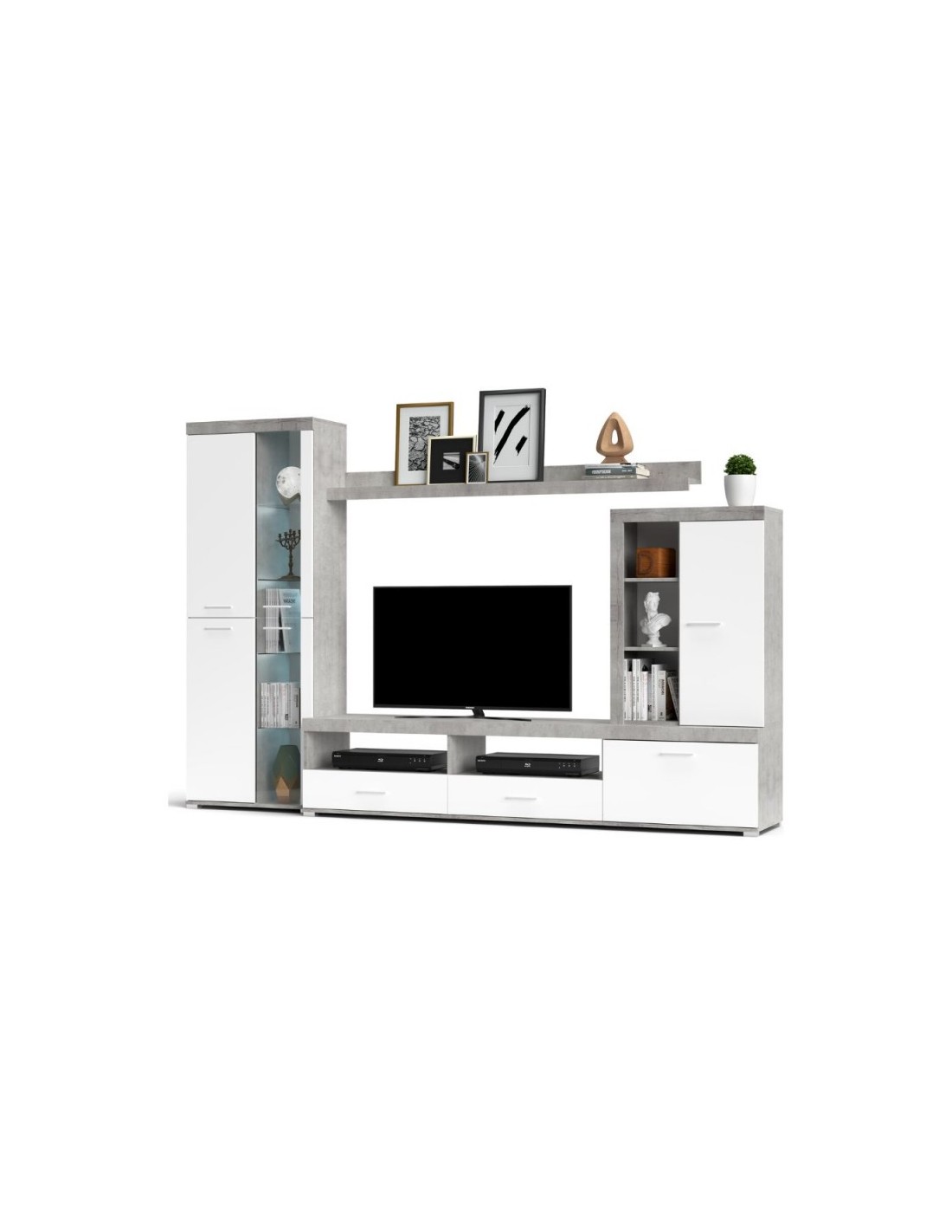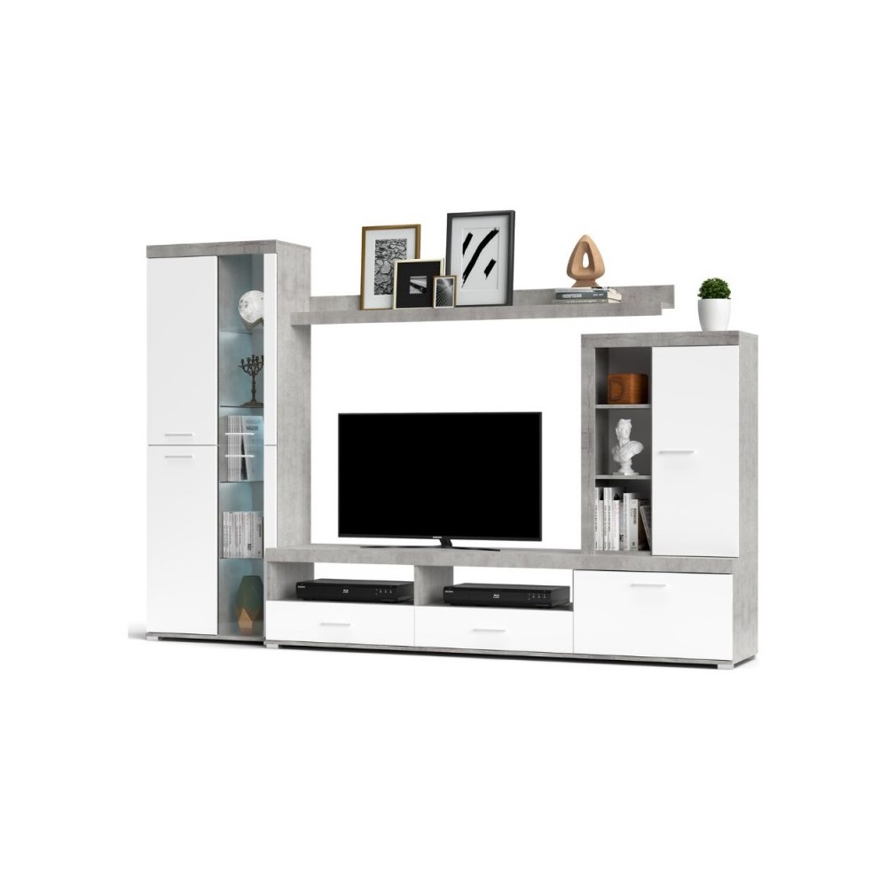 La parete attrezzata Club3 nelle finiture cemento e bianco, è perfetta per arredare il tuo living in stile moderno. L'alternanza di vani a giorno e chiusi, renderà semplice disporre gli oggetti a proprio piacimento avendo sempre tutto in ordine. Molto utili i ripiani per i dispositivi digitali proprio sotto allo spazio dedicato alla tv. Le ante a vetro donano raffinatezza a tutta la parete.