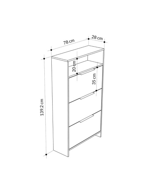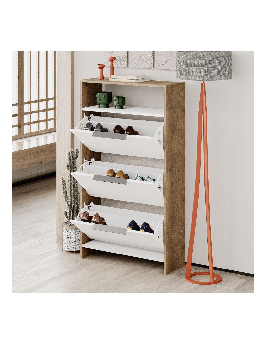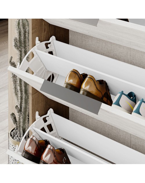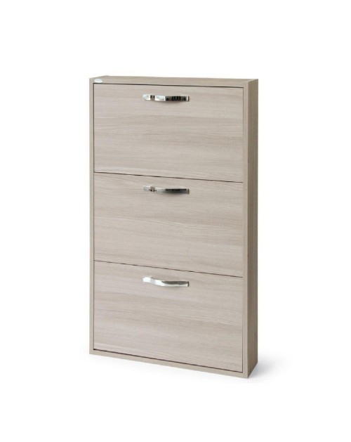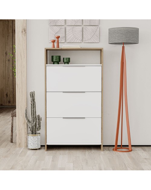 La scarpiera 3 ante a ribalta Kaju è il prodotto per avere tutte le scarpe in ordine senza rinunciare allo stile. E' dotata di 3 ante a ribalta dove potrai riporre 6 paia di scarpe per ogni vano. Inoltre nella parte superiore troviamo un comodo vano a giorno.