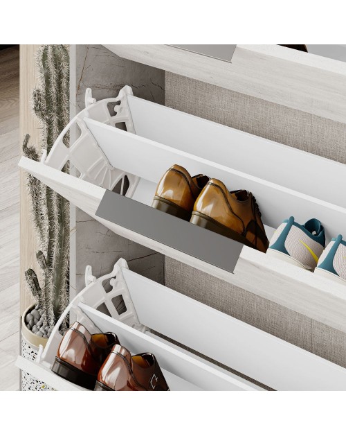 La scarpiera 3 ante a ribalta Kaju è il prodotto per avere tutte le scarpe in ordine senza rinunciare allo stile. E' dotata di 3 ante a ribalta dove potrai riporre 6 paia di scarpe per ogni vano. Inoltre nella parte superiore troviamo un comodo vano a giorno.