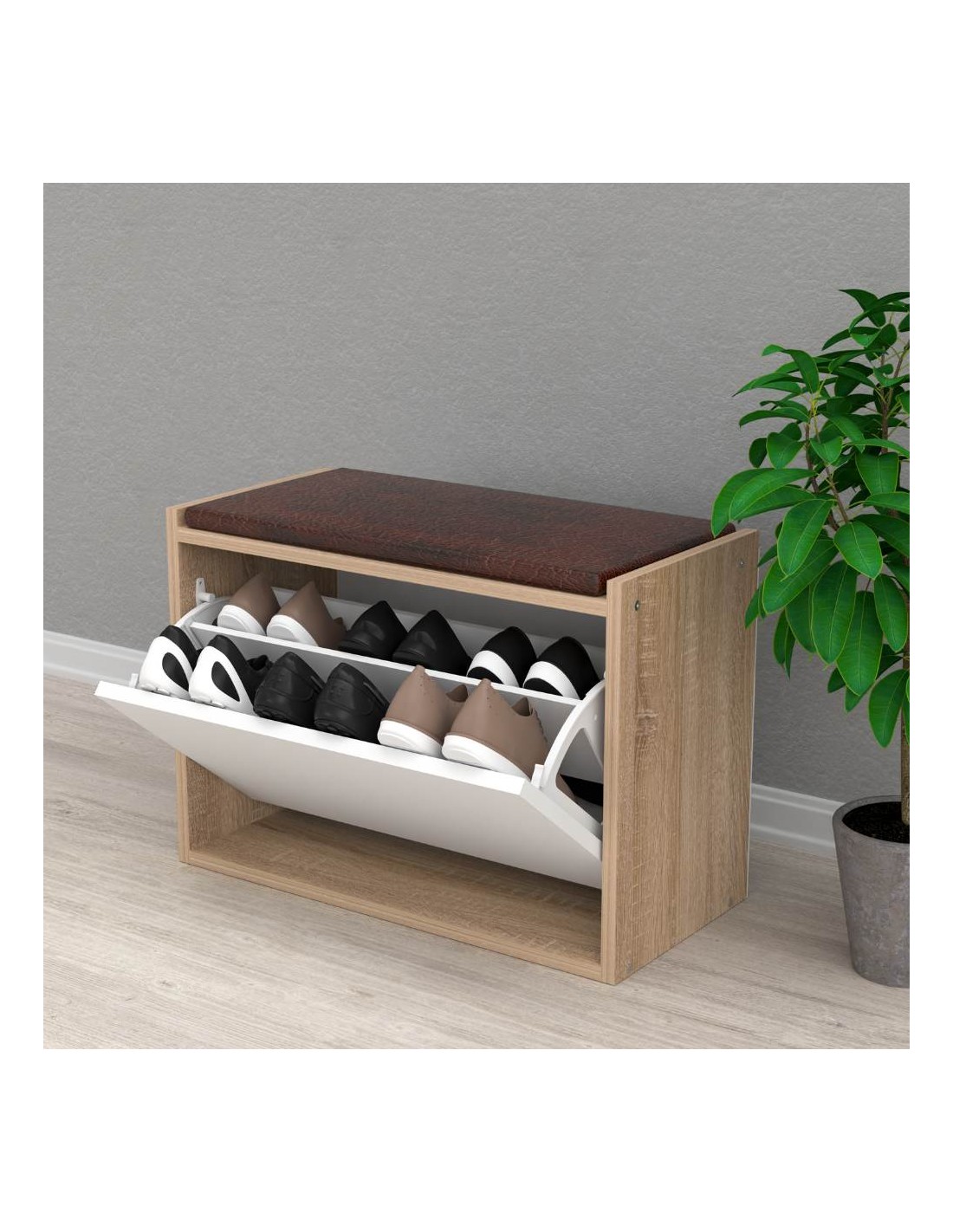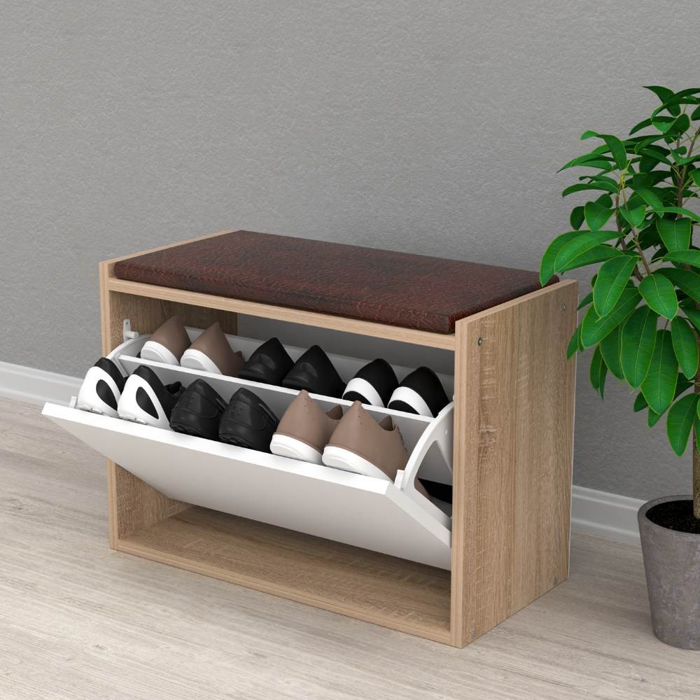 Pratica ed elegante scarpiera con cuscino decorativo. Dotata di anta a ribalta che al suo interno contiene due ripiani. Oltre a contenere in modo ordinato e discreto le scarpe, presenta anche un comodo il cuscino imbottito.