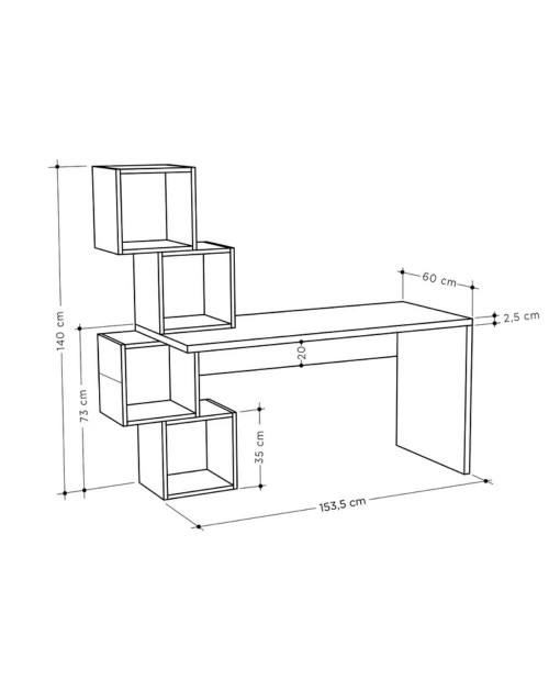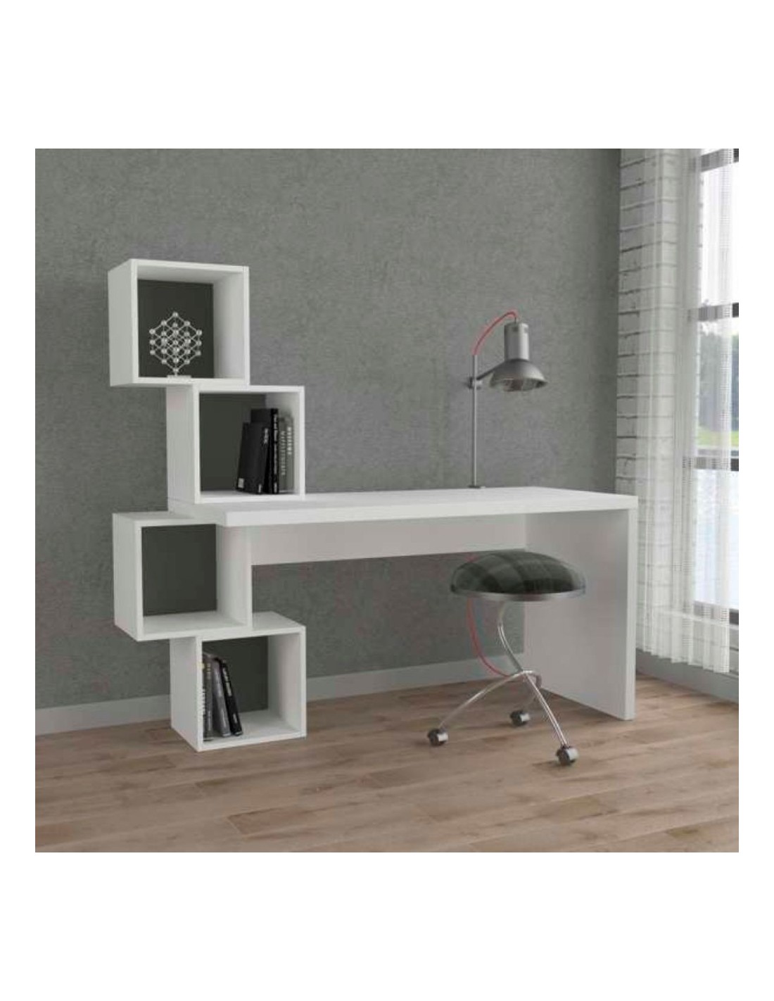 Libreria moderna di design caratterizzata da 4 cubi dove potrai riporre libri, stampante e tanto altro. Soluzione ottimale per arredare l'ufficio, lo studio oppure la cameretta dei tuoi bambini. Realizzata con MDF alta qualità da 30 mm per la scrivania e 18 mm per i 4 cubi.