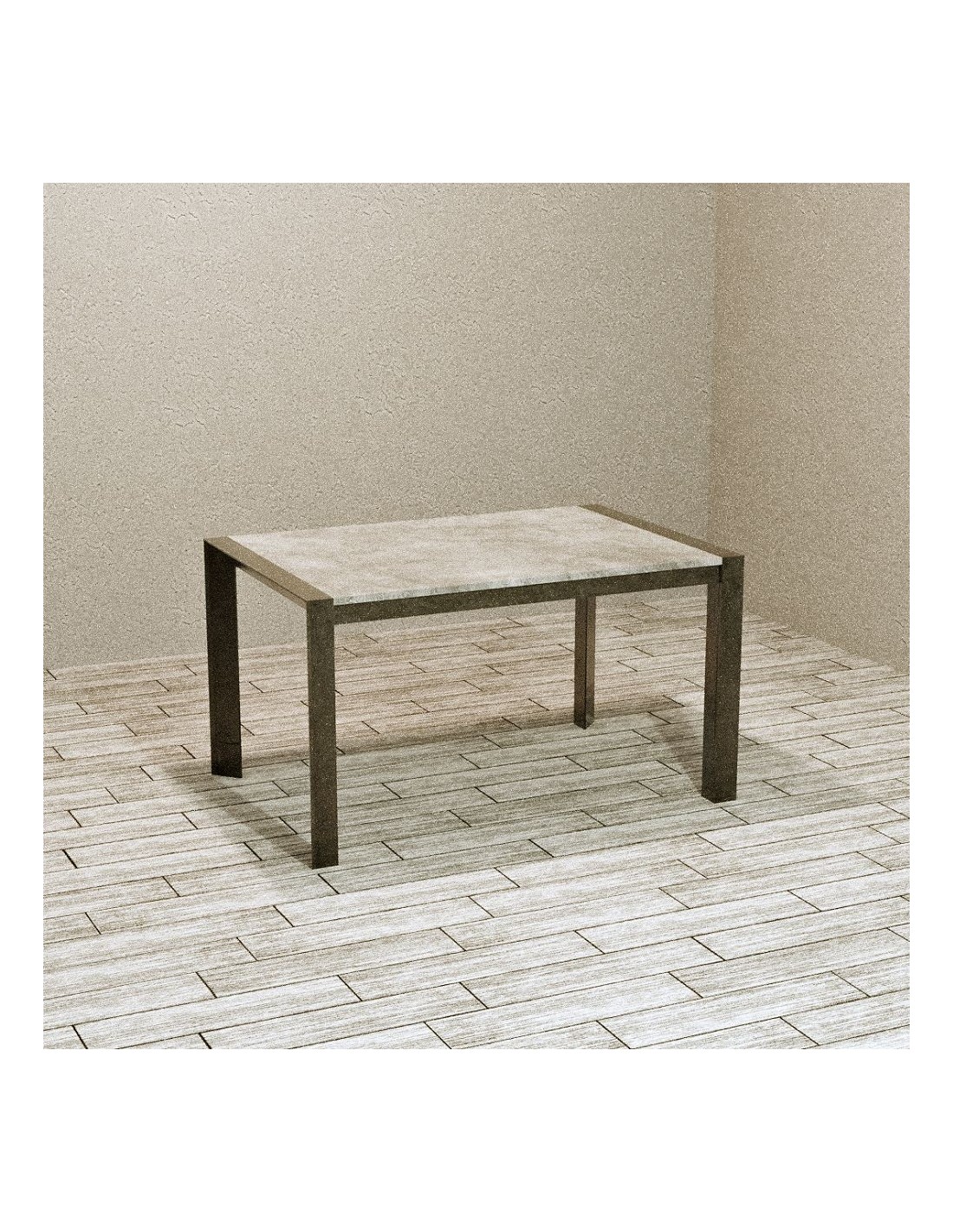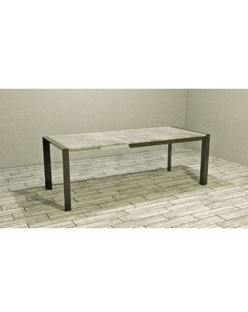 Tavolo allungabile di forma rettangolare. La struttura è in metallo verniciata antracite mentre il piano è effetto cemento. Grazie alla prolunga di 60 cm possiamo allungarlo fino a190 cm.