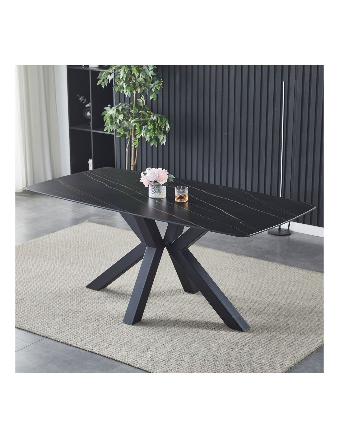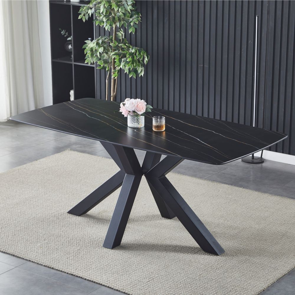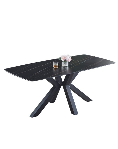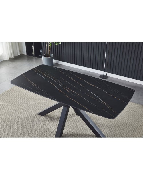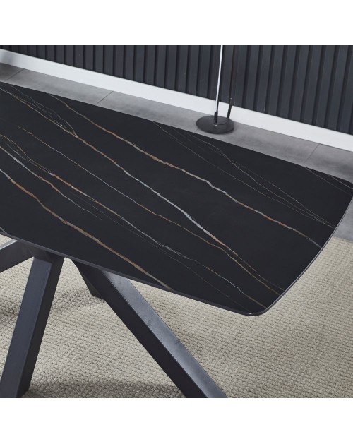 Si caratterizza per il top da 12 mm in ceramica effetto marmo nero e i piedi incrociati in metallo nero.