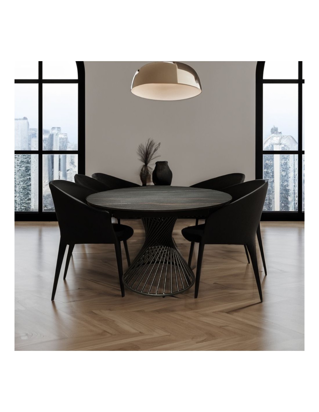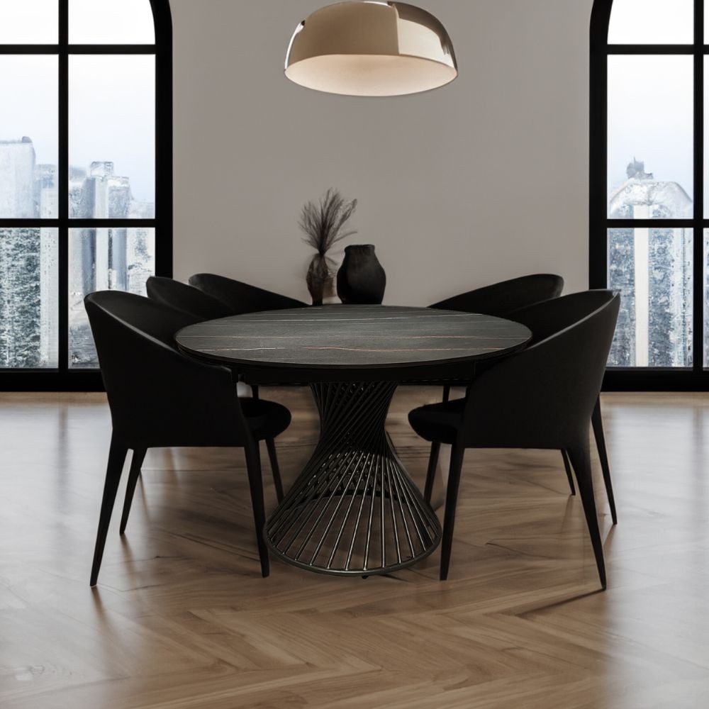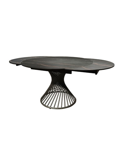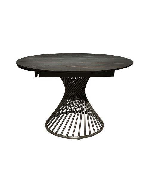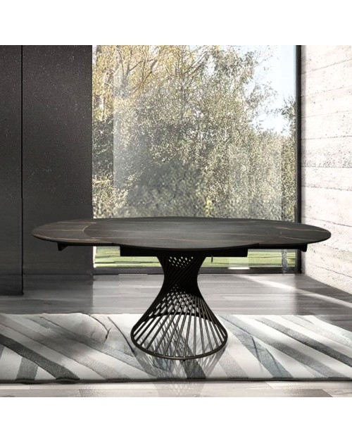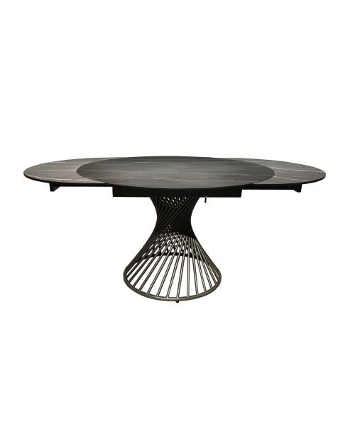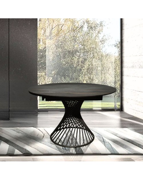 Tavolo allungabile rotondo top ceramica nero oro opaco e base a spirale in metallo nero Horus 120x120x76h
