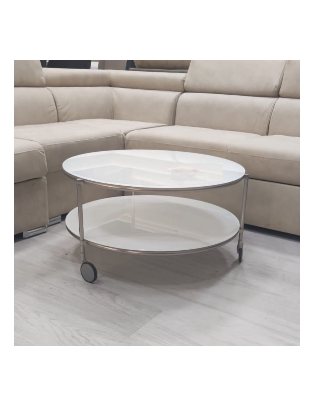 Tavolino basso rotondo struttura ferro e ripiani vetro bianco Tavolotondo