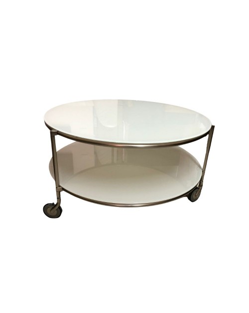 Tavolo di design con ripiani in vetro bianco e ruote. Adatto per arredare il salotto, l'ufficio, la reception oppure il tuo studio.