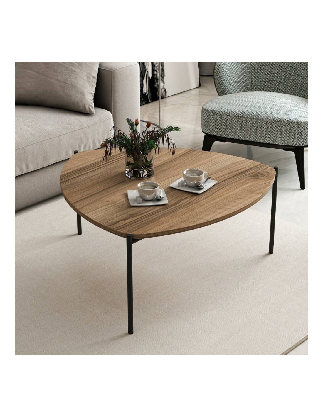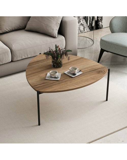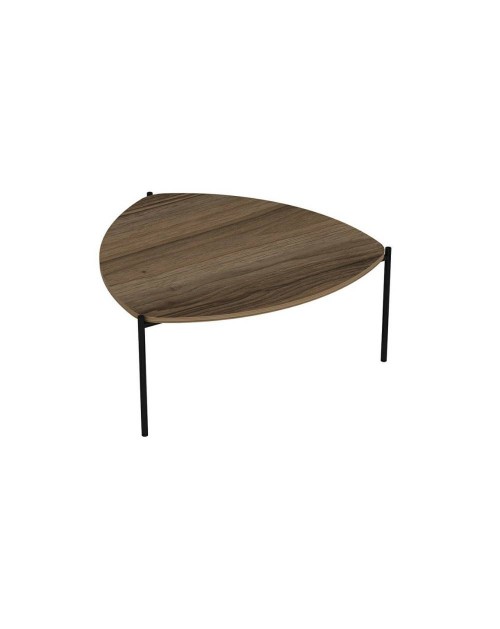 Il tavolino da salotto Lenny noce è perfetto per il tuo salotto. La particolare forma lo rende unico, mentre la stuttura in ferro a tre gambe garantisce solidità.