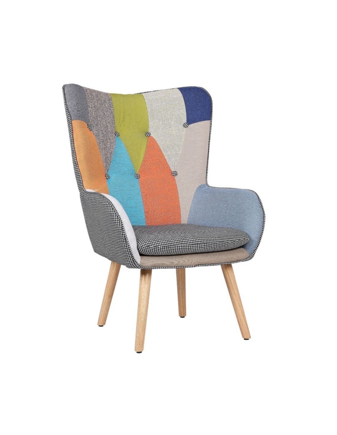 Comoda ed originale poltrona, caratterizzata dallo schienale avvolgente e tessuto patchwork. Ideale per arredare il tuo living oppure ogni angolo della tua casa. La seduta è morbida e garantisce momenti di relax leggendo un libro oppure guardando un film. Realizzata con materiali di qualità e particolare attenzione al dettaglio.