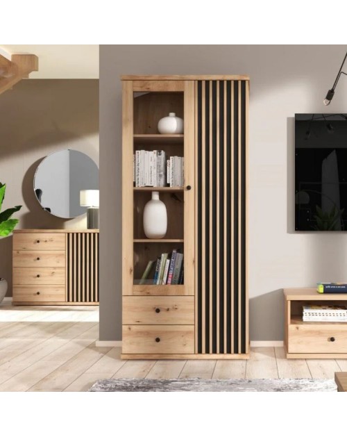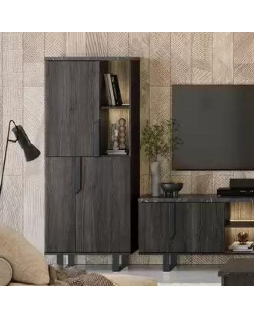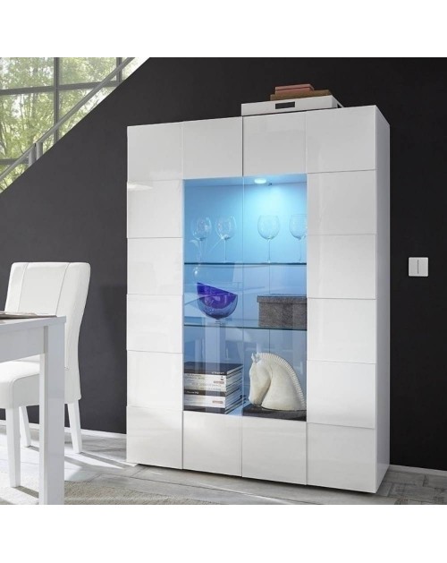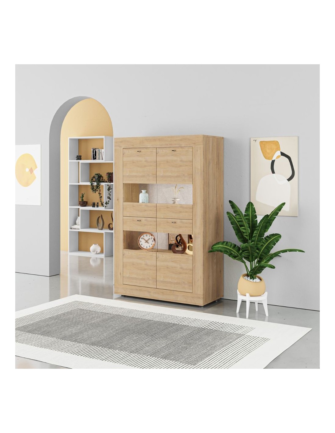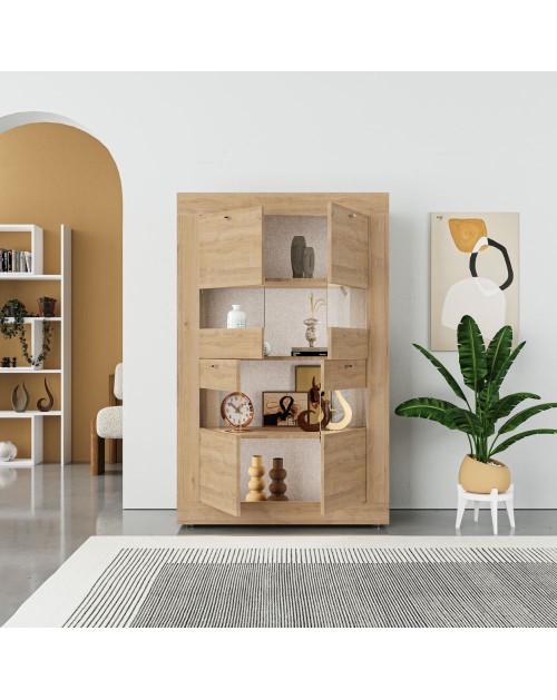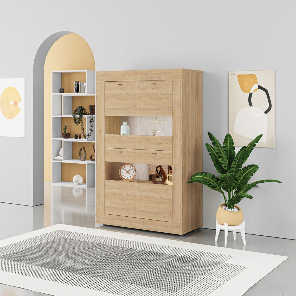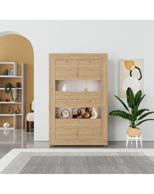 Vetrina da soggiorno in finitura rovere. Stile contemporaneo, raffinato ed elegante che ben si sposa con i tuoi ambienti. Le 4 ante, composte da legno e vetro, accoglieranno tutti i tuoi oggetti che potrai posizionare su 3 solidi ripiani.