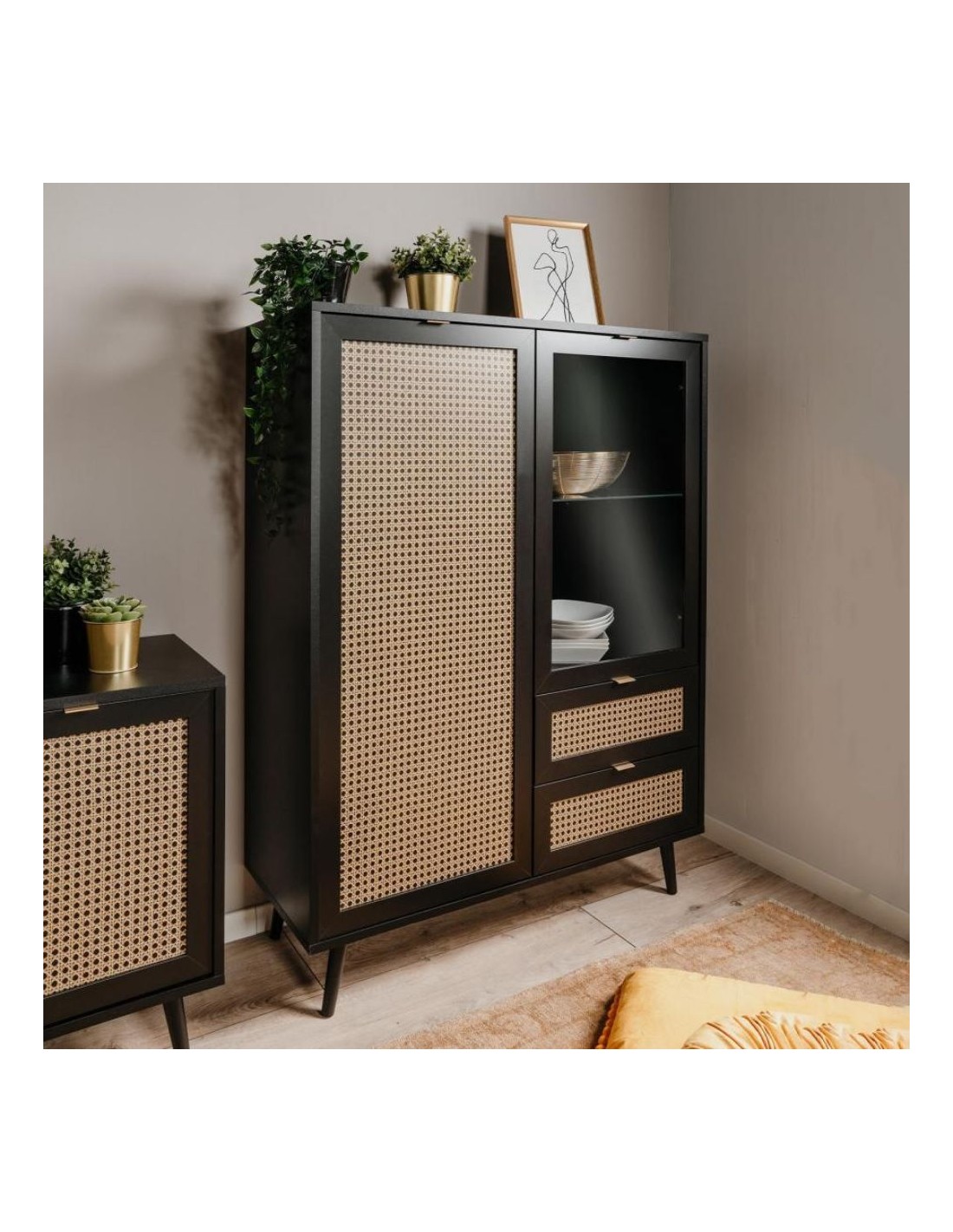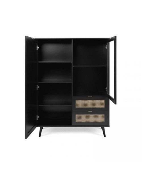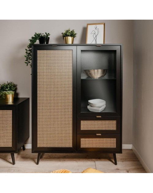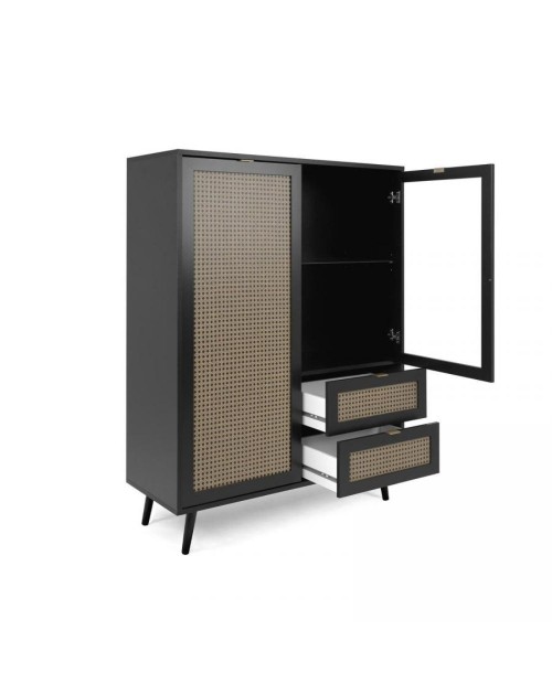 Vetrina 2 ante e 2 cassetti nera con frontali effetto vimini Vienna53A